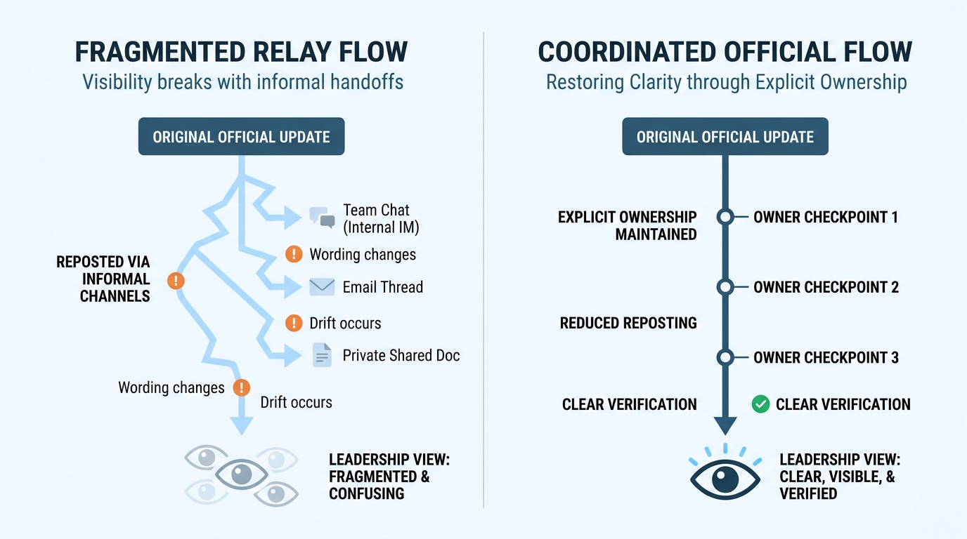 Updates start in one official channel, then move through committee chat threads, side summaries, and local reposts. Each handoff seems harmless. Together they create a system where leadership loses a clear view of message integrity.